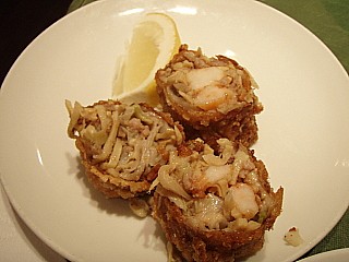 蝦や野菜を豚肉で巻いて揚げてるのかな。