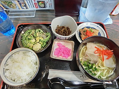 沖縄そばハーフ・ミニゴーヤチャンプル・三枚肉煮・もずく・ライス(小)とあれもこれも少しずつ食べたい女子向きのセットですね~。