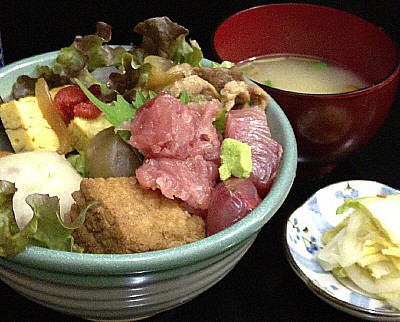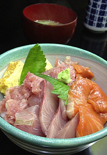 この日の三色丼はマグロのすき身にサーモン、ブリの3種類。