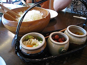 オーダーすると千切りキャベツとお新香3点セットが付いてきます。