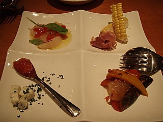 4種類の前菜は帆立のマリネ、チーズ、ラタトゥユに加え、なんと生のとうもろこしが!