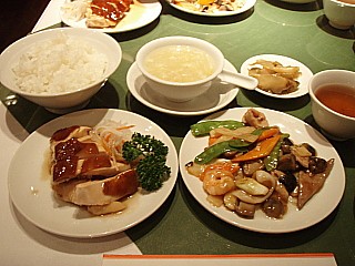 まずは若鶏の広東風醤油煮込みと八宝菜、コーンスープ、ザーサイ、ライスが運ばれてきました。