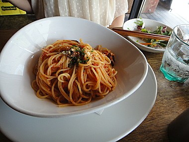 こちらは友人チョイスの揚げなすとモッツァレラチーズのトマトパスタ(600円)。