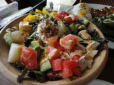 レタス・キュウリ・トマトに加え、チキンやアボガド、ポテト、パプリカ、チーズが入った盛り沢山のサラダです。